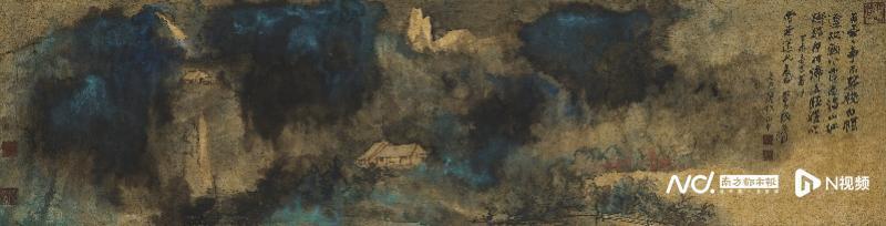 張大千(1899-1983)《云峰古寺》設(shè)色金箋鏡框 44.5×174.5公分 1967年