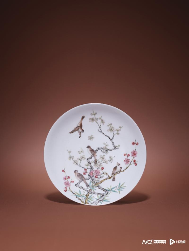 清雍正外烏金黑釉內(nèi)粉彩梅雀爭春圖盤雙圈三行六字楷書款