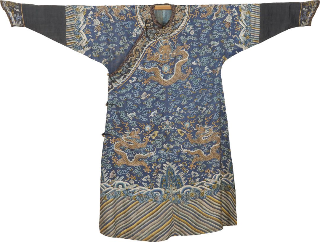 北京服裝學(xué)院民族服飾博物館收藏的清代滿族藍(lán)色緙絲金龍?jiān)萍y夾袍,面料使用緙絲工藝織造,緙織金龍八條,間以如意云、蝙蝠、壽桃、八吉祥等吉祥紋樣,織造工藝精湛,紋樣造型生動(dòng)。龍袍下擺裝飾山石寶物,立于波濤翻滾的水浪之上,寓意四海之內(nèi)江山永固、萬(wàn)世升平。