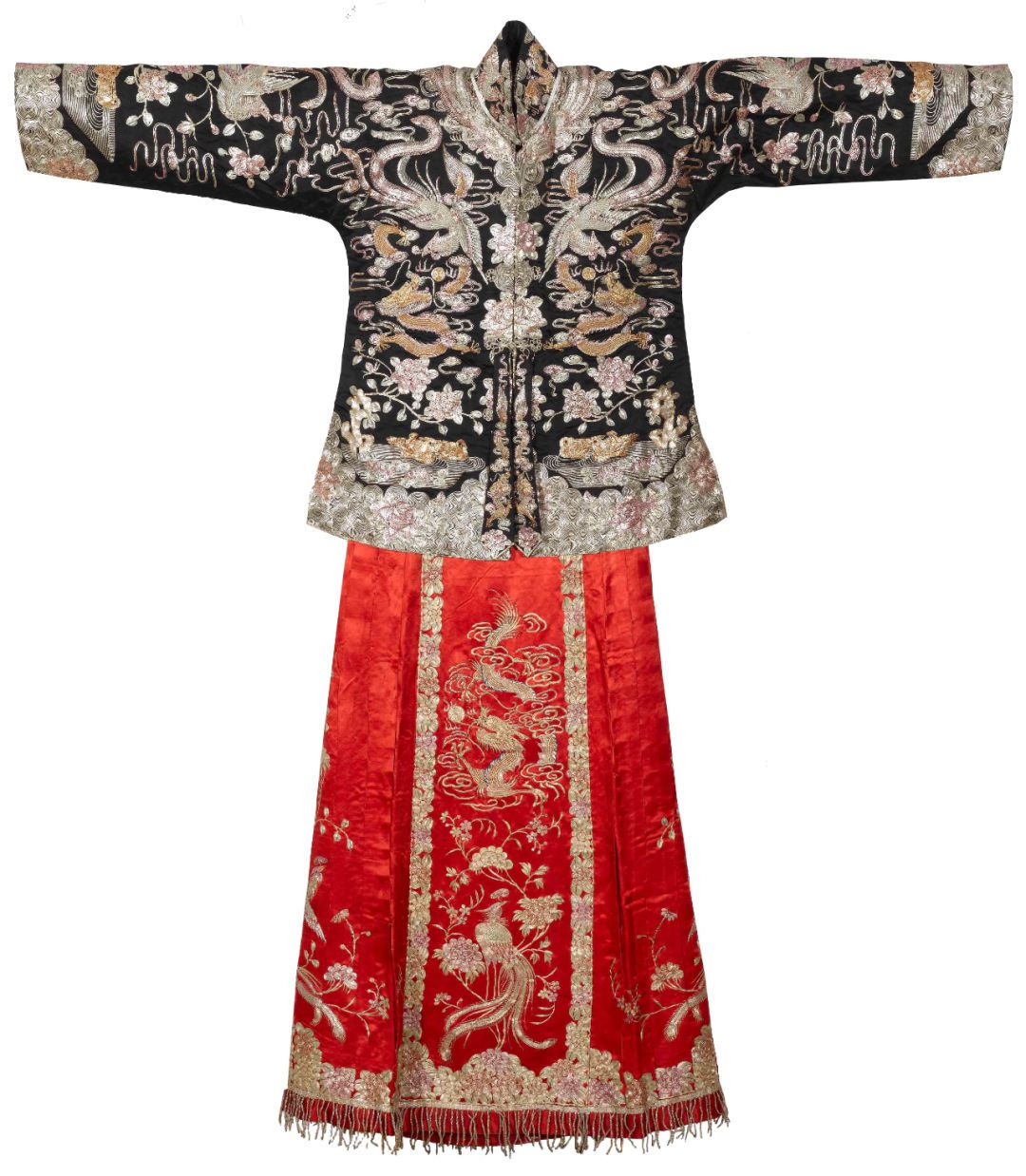 與滿族龍袍中威嚴(yán)莊重的形象相映成趣,館藏清代至民國(guó)時(shí)期的漢族平金銀龍鳳紋女嫁衣上的龍鳳呈祥紋樣呈現(xiàn)出一派喜慶祥和的景象。嫁衣上身為青緞平金銀迭繡龍鳳紋女褂,下裝配大紅緞平金繡龍鳳紋馬面裙,左右衣身用金、銀線盤繡出龍、鳳、鴛鴦、牡丹、蓮花、祥云等吉祥紋樣,并以門襟為中心對(duì)稱分布,形成“對(duì)龍對(duì)鳳”的構(gòu)圖樣式,華美富麗。
