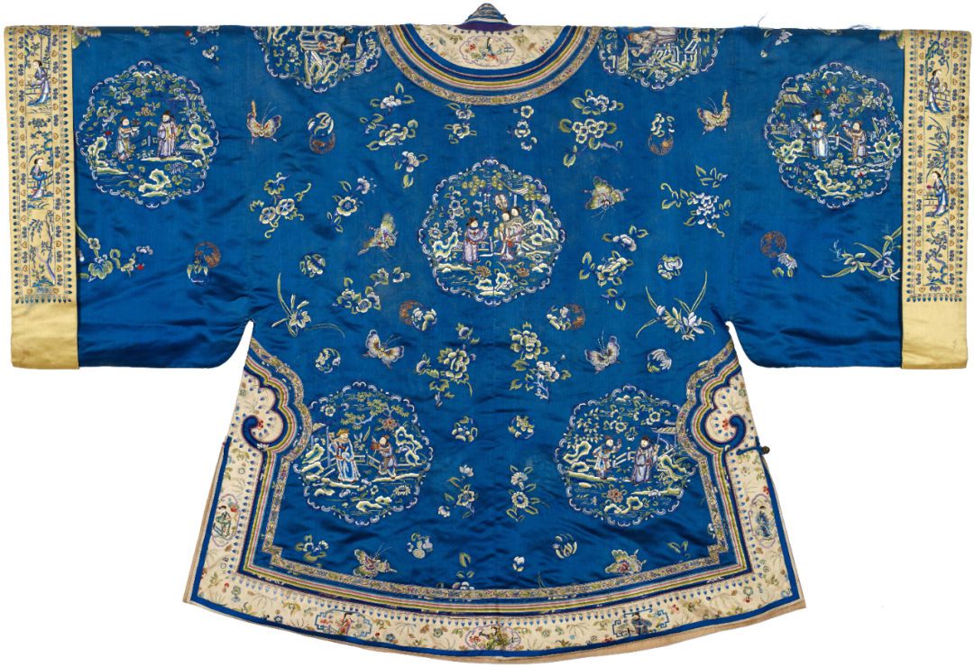 ▲漢族藍(lán)色緞五彩繡十二團(tuán)窠人物紋廣袖女襖背視圖。
