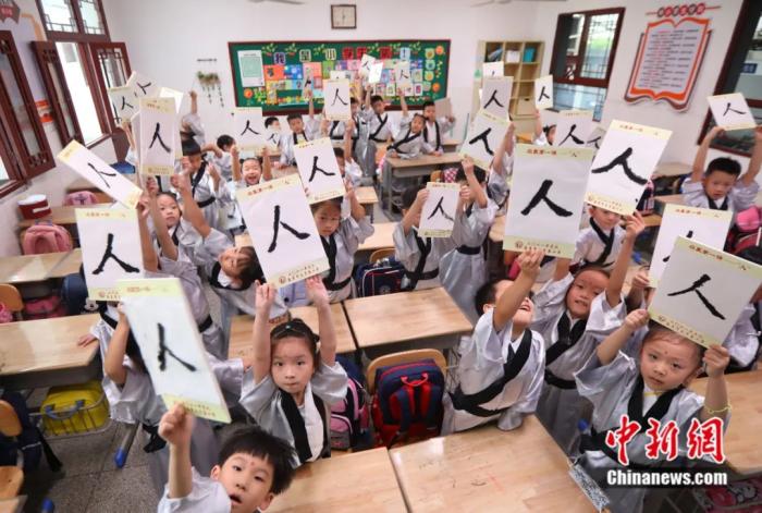 南京夫子廟小學(xué)一年級(jí)的新生身穿古代儒生禮服,在老師的帶領(lǐng)下祭拜孔子、誦讀《論語(yǔ)》、學(xué)寫“人”字,參加“開筆禮”儀式。中新社記者泱波攝
