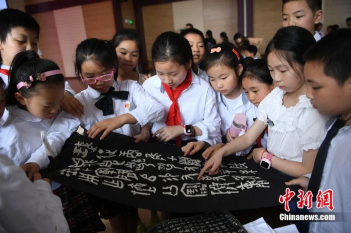 重慶南開小學(xué)的學(xué)生們?cè)凇凹坠俏膶W(xué)堂”進(jìn)校園活動(dòng)中欣賞甲骨文書法作品。中新社記者陳超攝