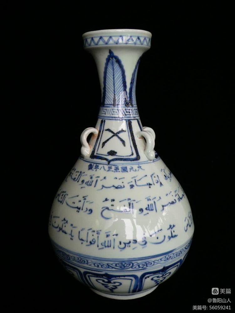 2.玉壺春瓶(見附圖)黑褐釉色,園腹、長頸、撇口、圈足,高約30厘米,器型端莊大氣,腹部前后書寫同款阿拉伯文字,工藝同上。經(jīng)辨認(rèn)該組文字意為:“安拉乎”,意真主至大。