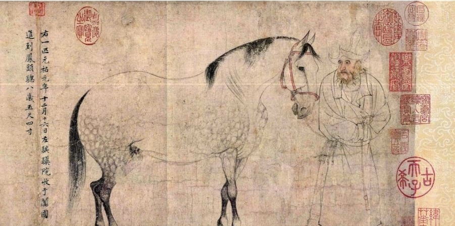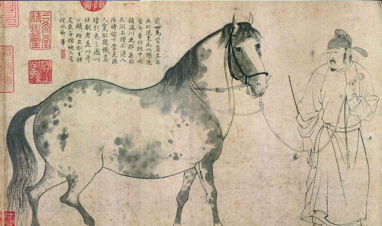 李公麟《五馬圖》,紙本手卷,縱29㎝,橫225㎝,以白描手法繪五組人馬。五位奚官前三人為西域胡人裝束,后二人為中原漢人服飾。五匹馬分別為鳳頭驄、錦膊驄、好頭赤、照夜白、滿川花。此卷曾藏清宮內府200余年。晚清,山河飄零,溥儀盜運出宮,流入東瀛,現藏于日本東京國立博物館。李公麟《五馬圖》成就卓著,對后世影響巨大,成為歷代繪制人物鞍馬的最佳范本,被推為"宋代人馬圖第一"。