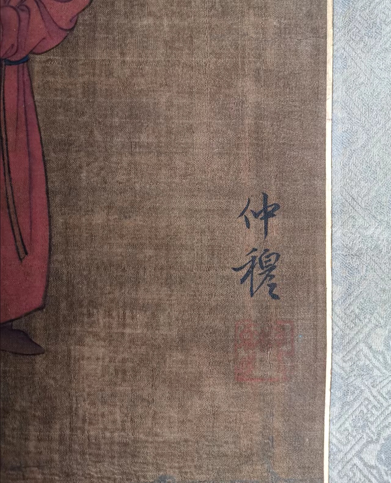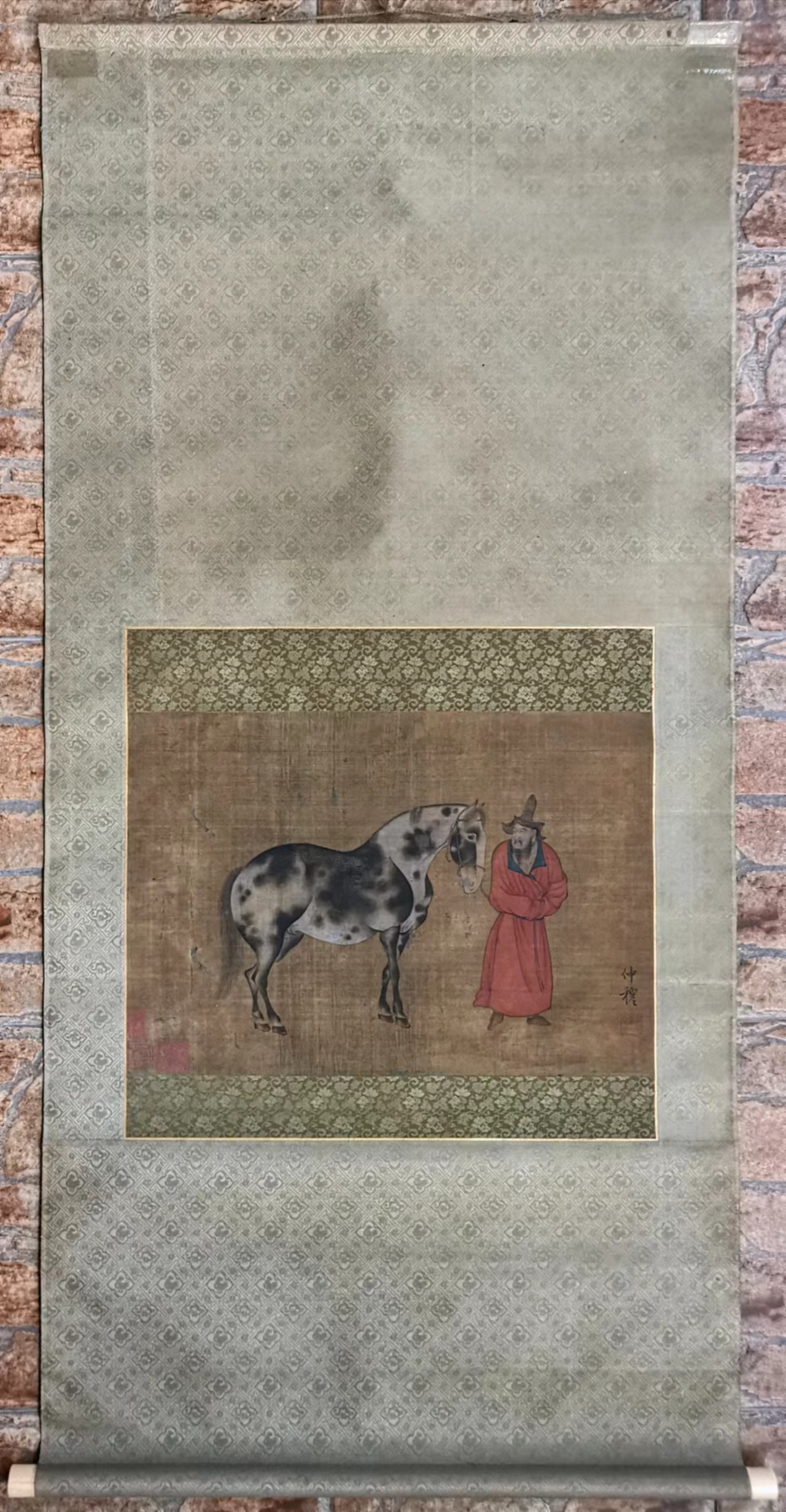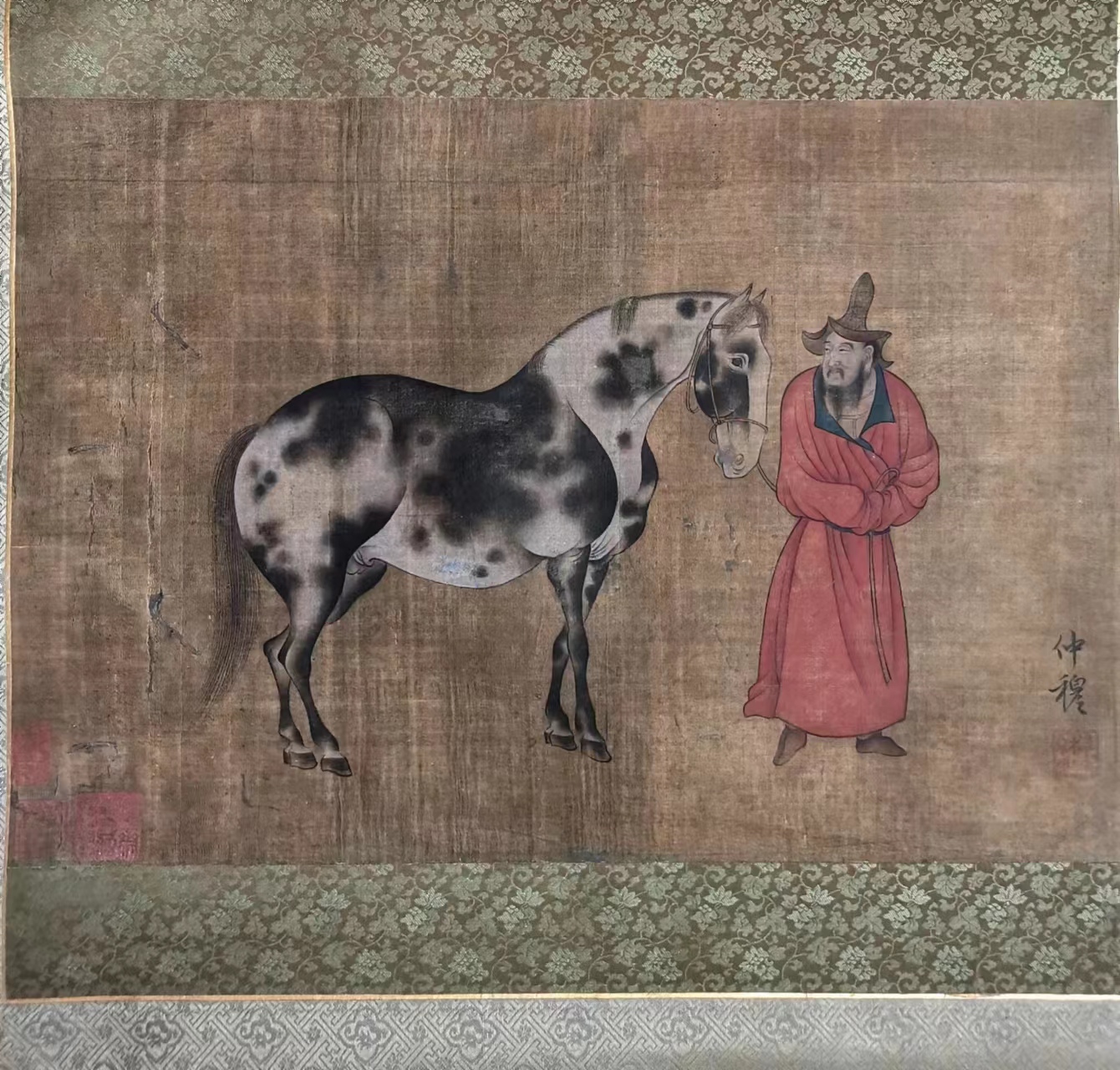 趙仲穆《人馬圖》,絹本,縱31㎝,橫45㎝,日本藏家舊庋。裝裱承北宋"宣和式",淺色花綾包鑲,畫心圍金色局條,上下嵌深色花綾錦眉,地桿兩端裝象骨軸頭。畫中繪一西域奚官,繩牽于闐良驥。右下屬行草款"仲穆",鈐朱文?。⒅倌拢ⅲ?.8Ⅹ1.8㎝。左下鈐收藏印三方:一、“宮氏農山鑒定",朱文印,1.5x2.7㎝。二、"徐紫珊鑒藏",朱文印,2.1x2.1㎝。三、“客齋鑒藏書畫",白文印,2.7x2.7㎝。以上四印著錄于《中國書畫家印鑒款識》(上海博物館編,文物出版社1987年12月第一版)P1357,"趙雍"條,第3號印;P846,“宮爾鐸"條,第28號印;P731,"徐渭仁"條,第28號??;P404,"吳大澂"條,第42號印。