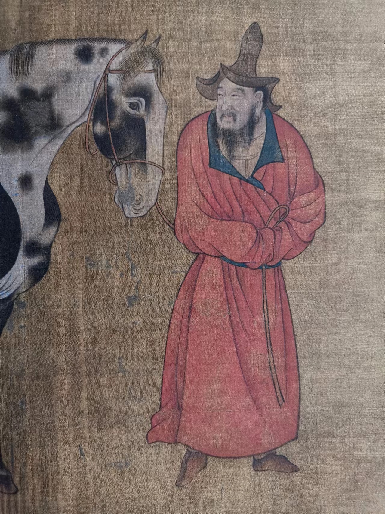 對照《五馬圖》,我們可以看出趙雍所繪《人馬圖》取樣為《五馬圖》中第一組人馬。但馬的造型雖為"鳳頭驄",而毛色花紋則取第五組的"滿川花",是為"二馬合一"。奚官的衣紋線條較李公麟時露圭角之方折,易為圓勁婉轉之流美;人物的須髯由扎亂理為齊順;形象由粗獷演為溫良,并敷以重彩。這些從構圖、線描、敷色、人物性格表現上的諸多更易,可以看作是趙雍在取法李公麟時既有傳承,又有推進的創(chuàng)作突破,這使得他的《人馬圖》在李公麟之后,有了別開生面的新樣式。